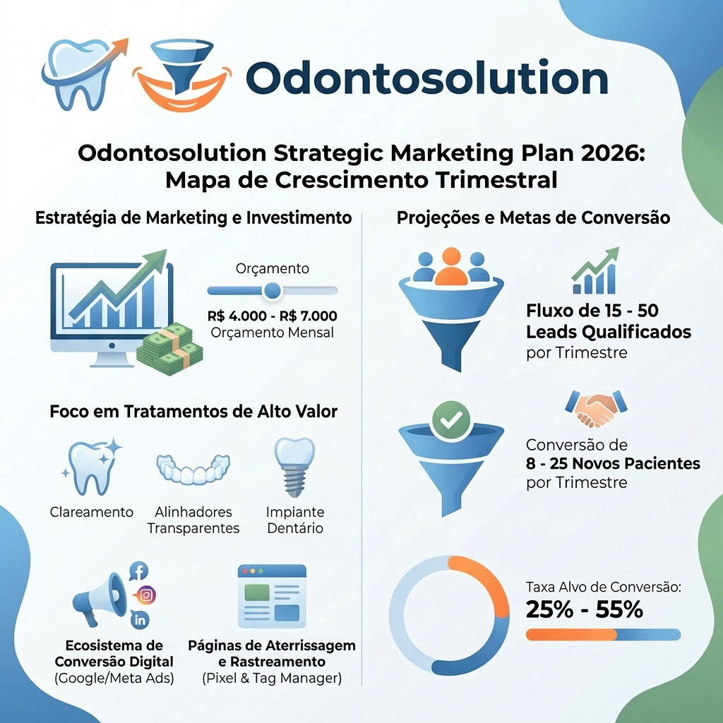 * Definição de objetivos reais: número de leads, foco em implantes, próteses e procedimentos de maior valor